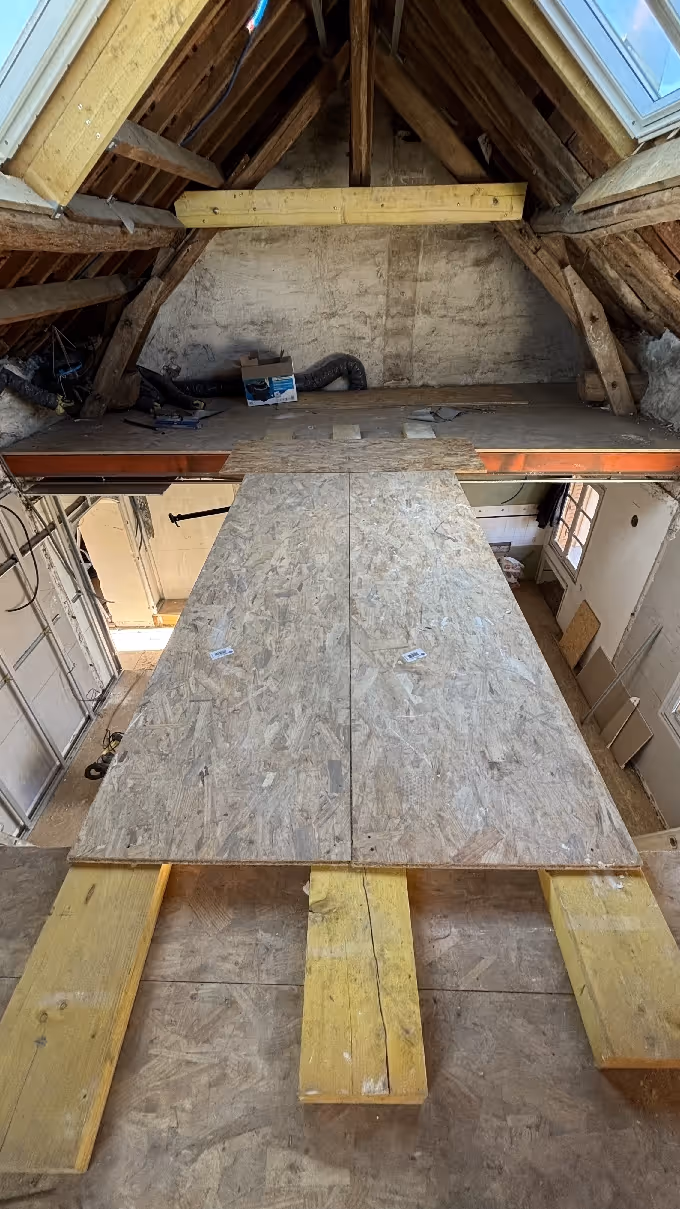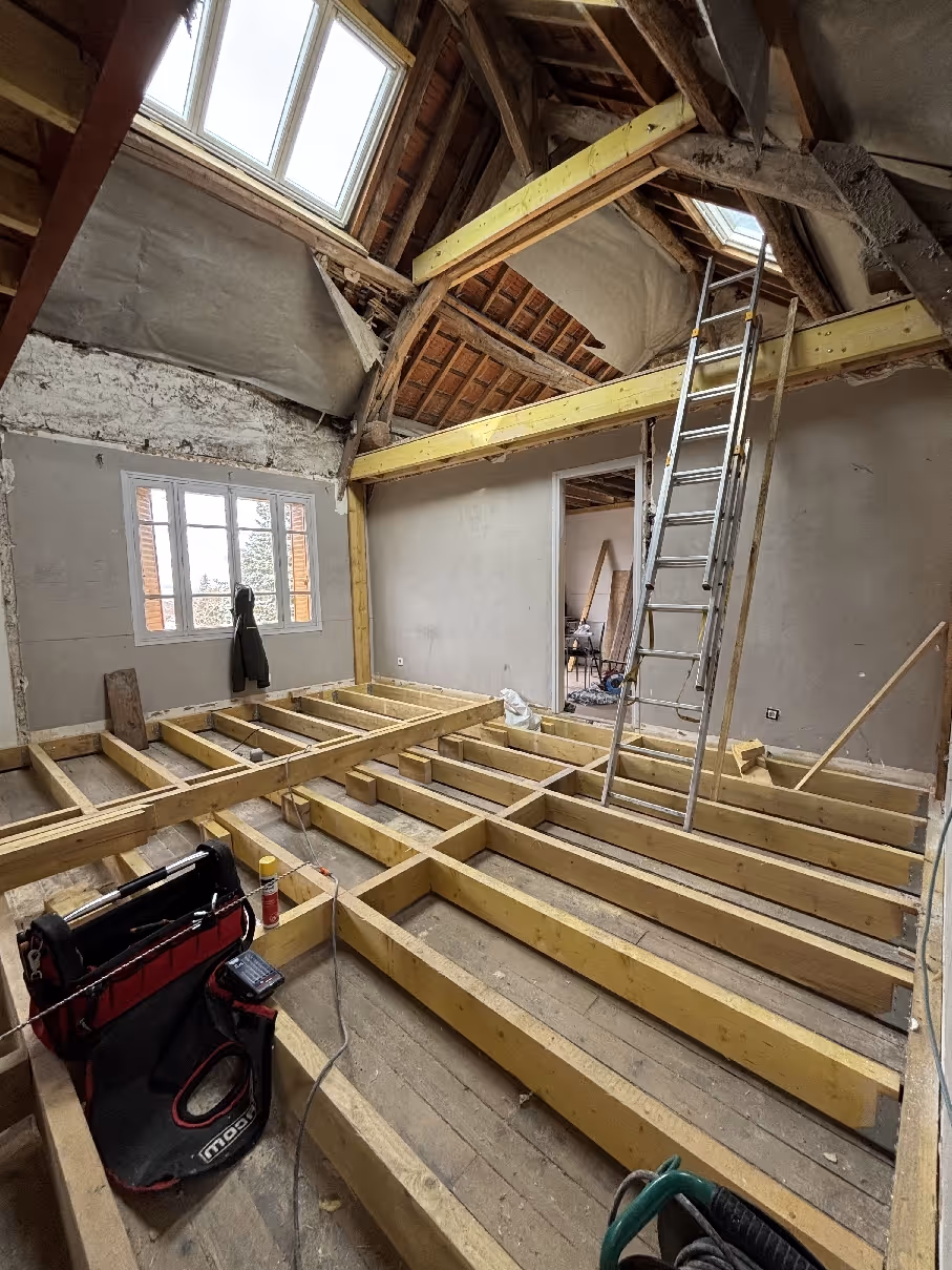 - Mise à niveau des sols (rehaussement des sols de 20 cm / isolation entre les bastaings venant recevoir le nouveau plancher)